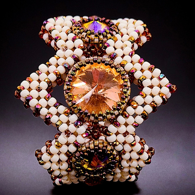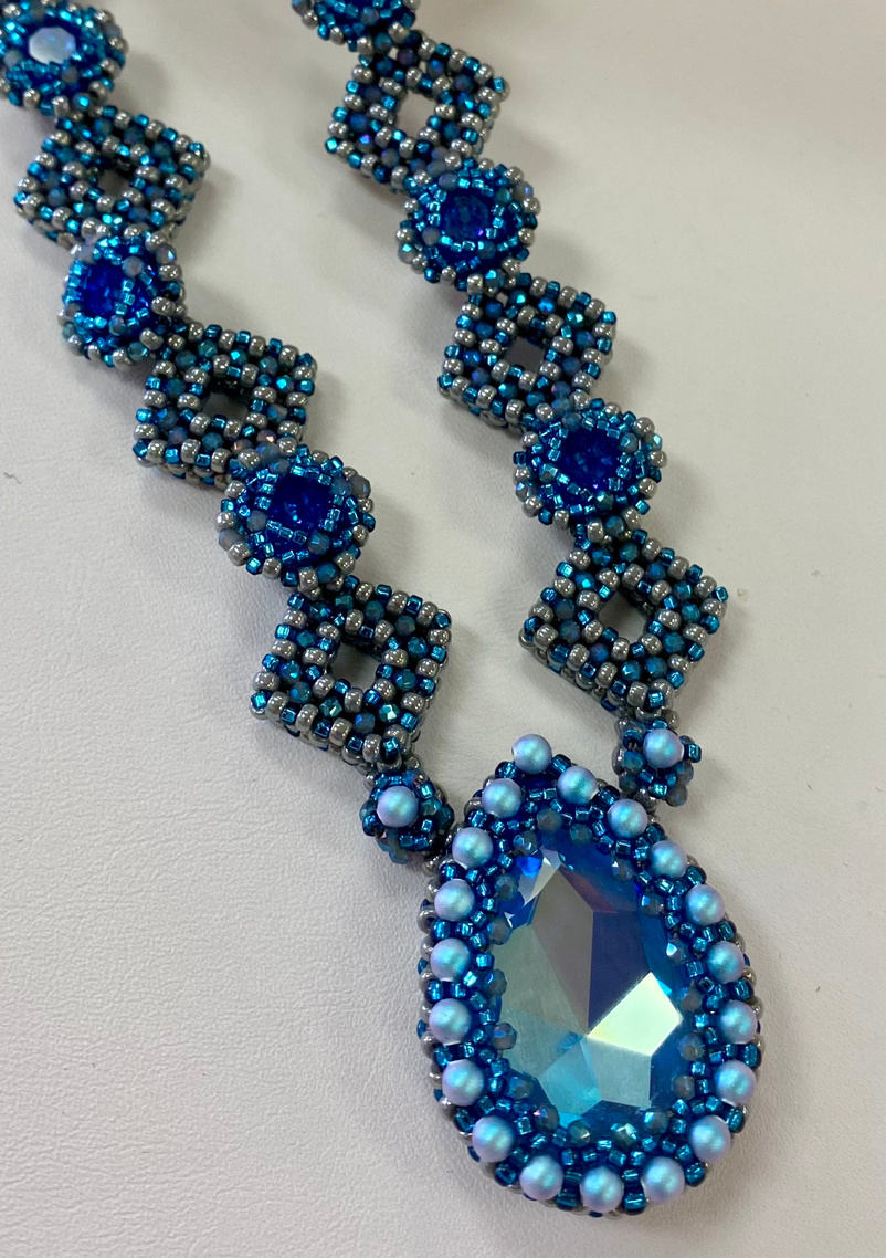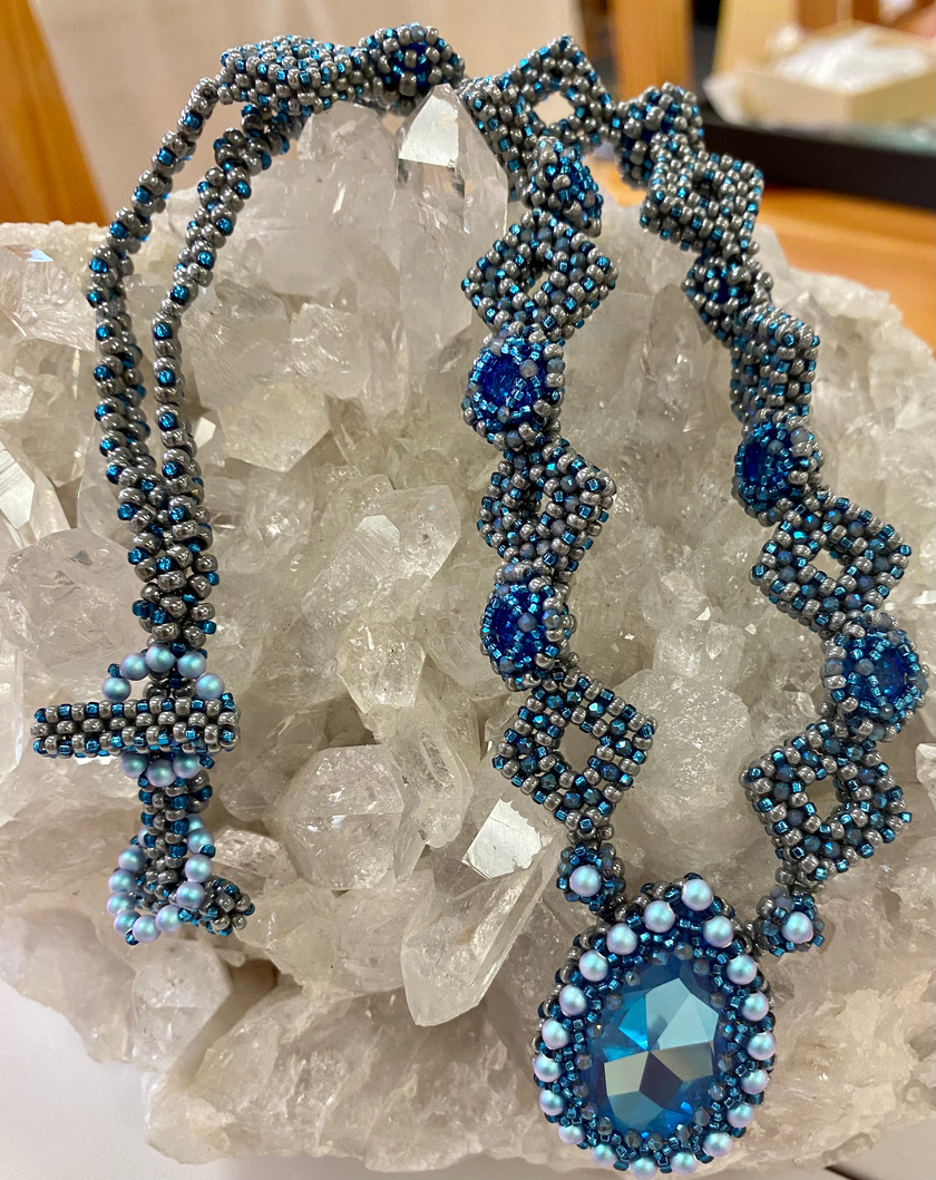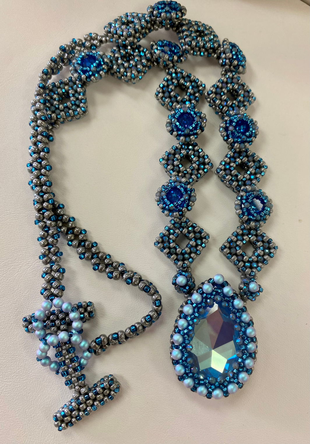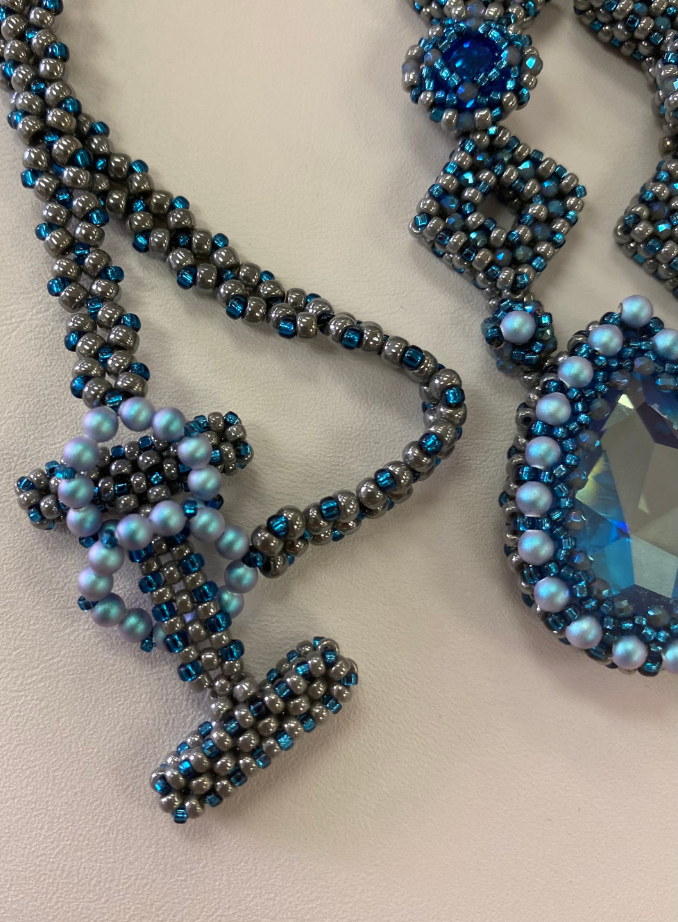 Stitches used in this piece include cubic right angle weave, Peyote, and Netting.