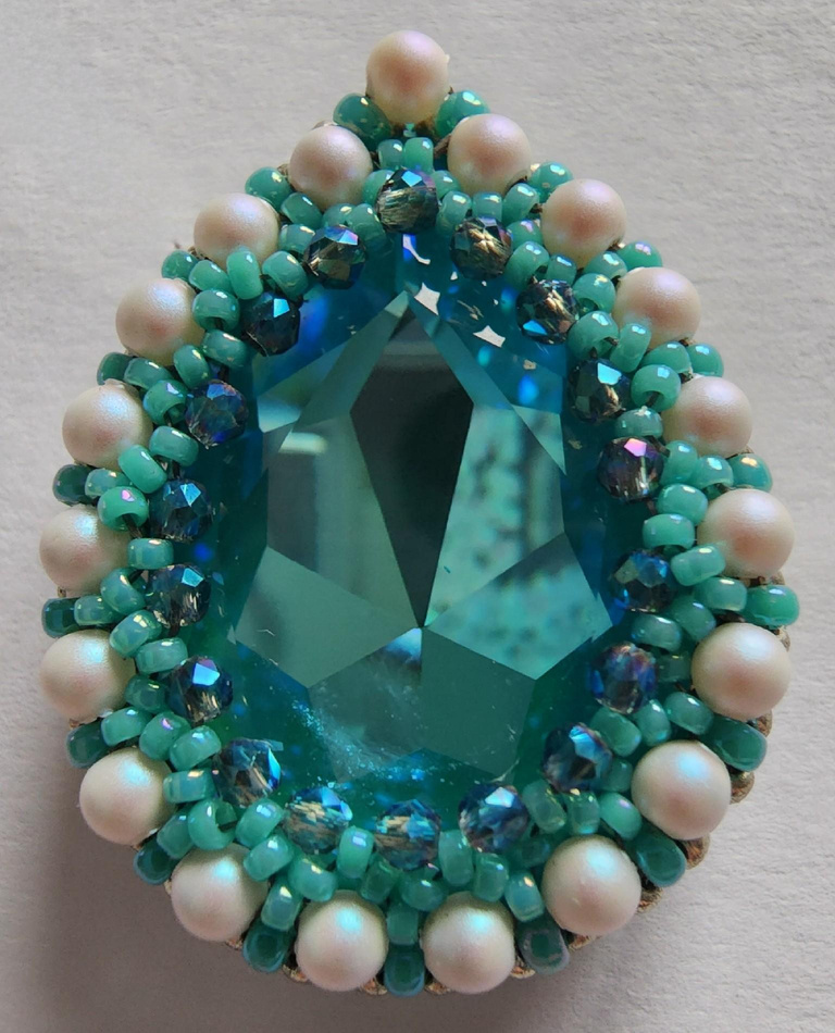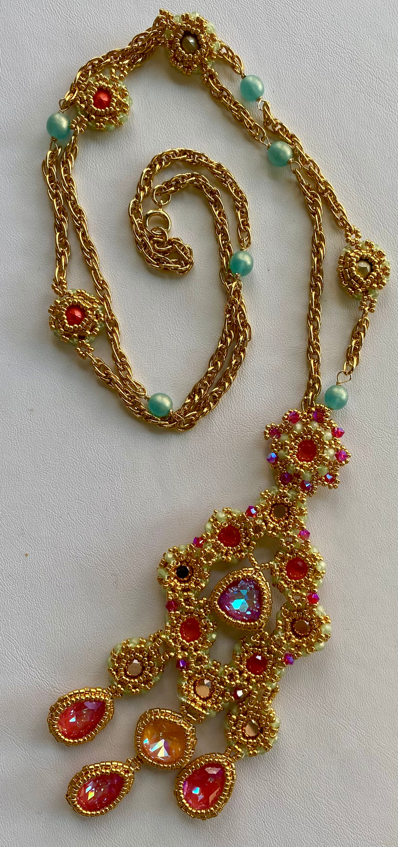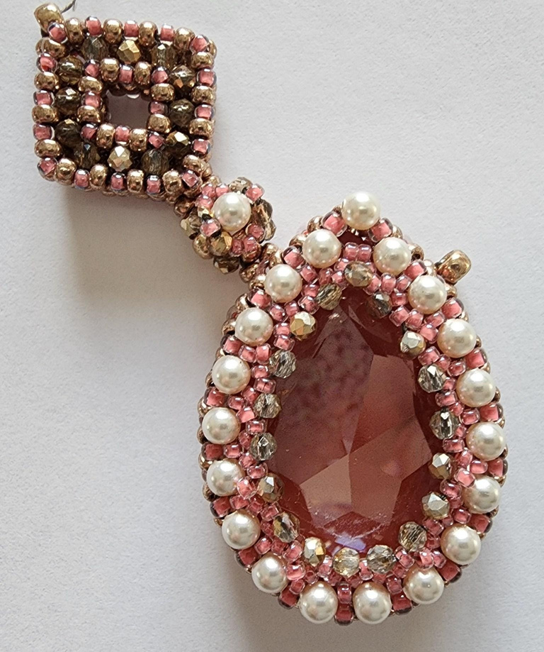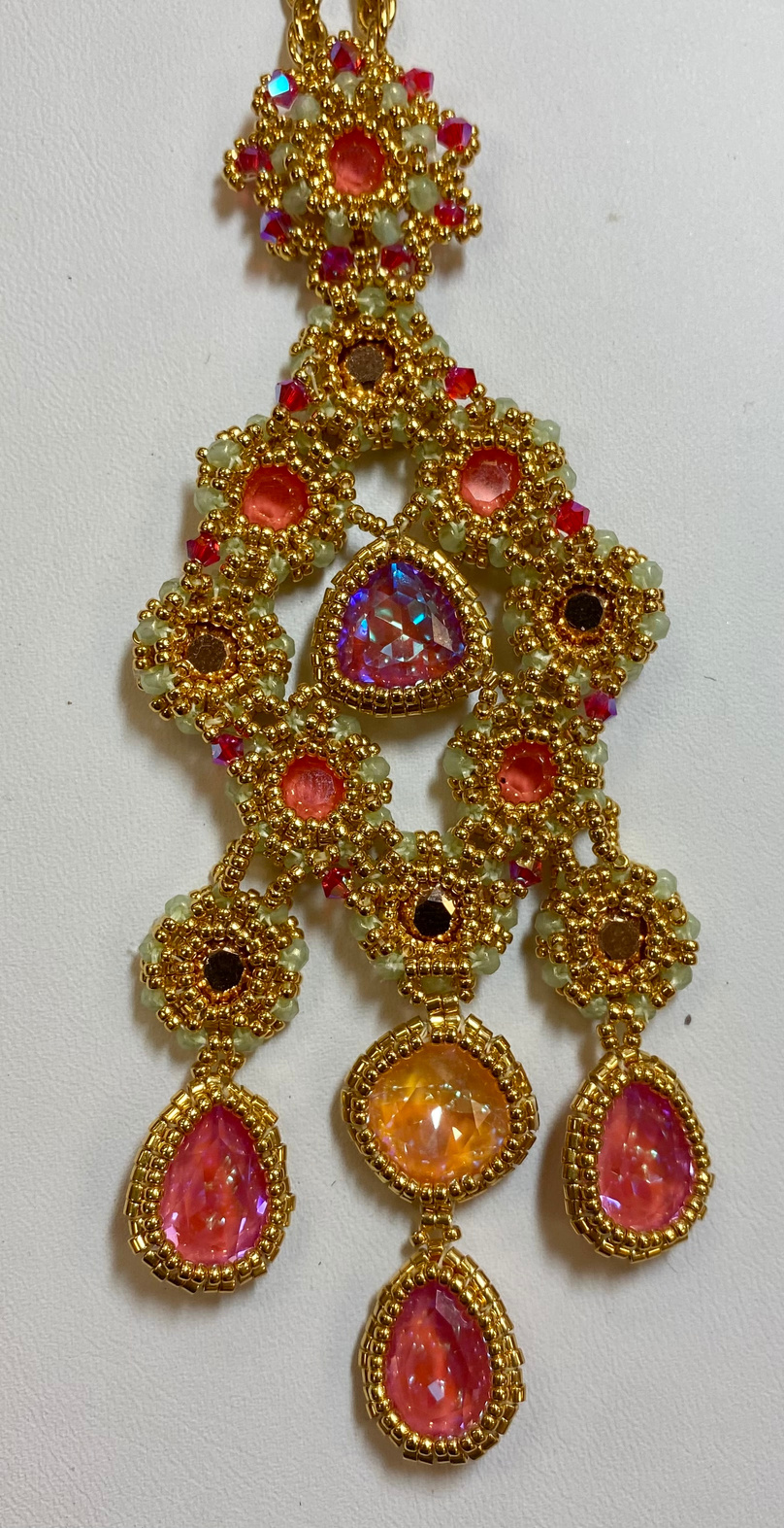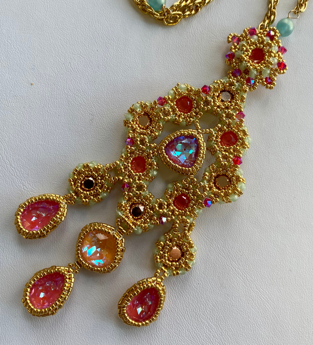 Stitches used in this piece include cubic right angle weave, Peyote, and Netting.